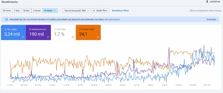 Trabajamos cada proyecto de manera personalizada, analizando palabras clave relevantes, mejorando la arquitectura del sitio, implementando datos estructurados (schema) y potenciando la autoridad con enlaces de calidad. Así, logramos que tu marca destaque en los primeros resultados de búsqueda y consolide su presencia digital a largo plazo. Con una estrategia sólida de marketing online y posicionamiento en buscadores, tu negocio no solo será más visible, sino también más competitivo.